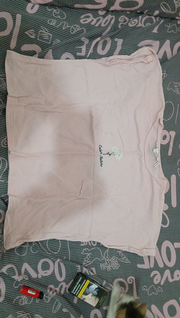 Pamuklu kumaştan yapılmış, bol kesim pembe tişört. Kısa kollu ve yuvarlak yaka, küçük baskılı detaylarla sade bir tarz sunar.