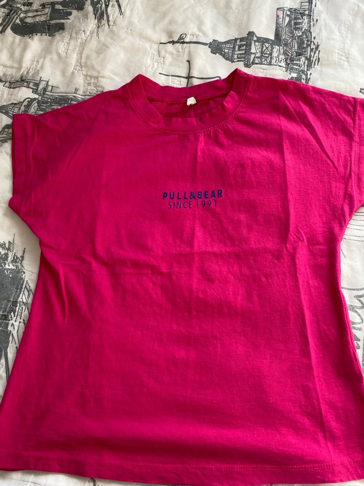 Pembe kısa kollu pamuklu tişört, yuvarlak yaka ve bol kesim ile rahat kullanım sunar. Önünde 'PULL&BEAR' baskısı bulunur, sokak stili ve günlük rahatlığı bir arada sunar.