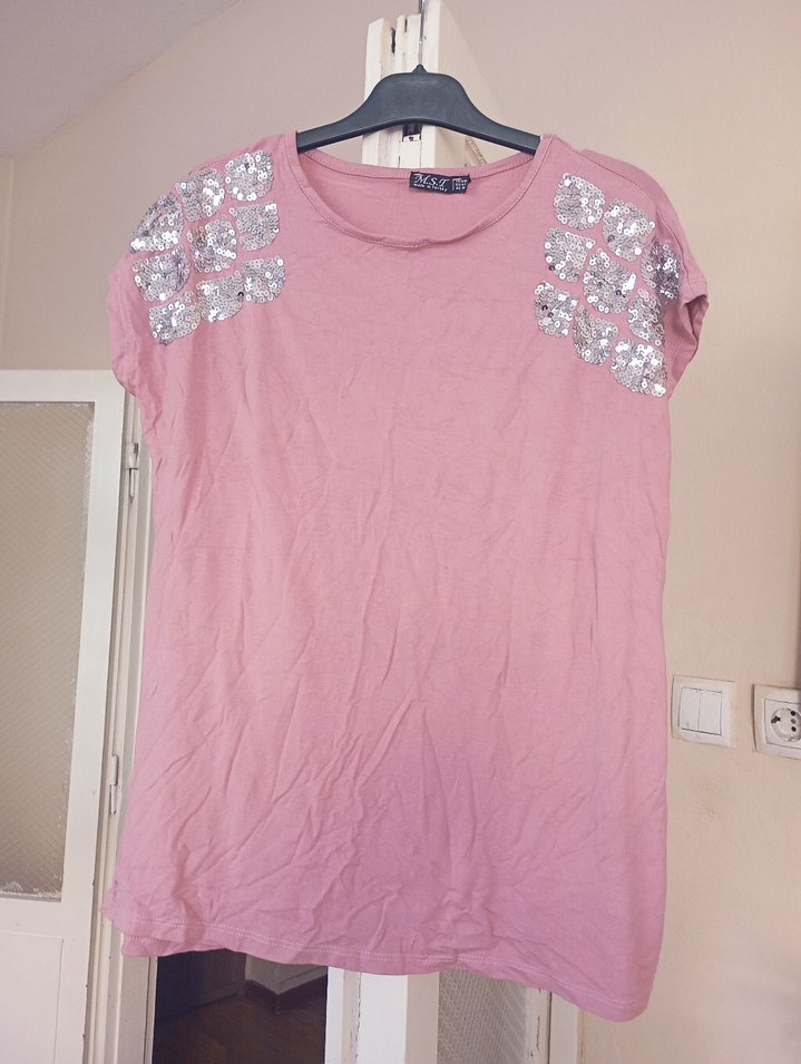 Pembe, kısa kollu, yuvarlak yaka ve bol kesim kız tişörtü, payetli baskılı detaylarla sokak modasına uygun.