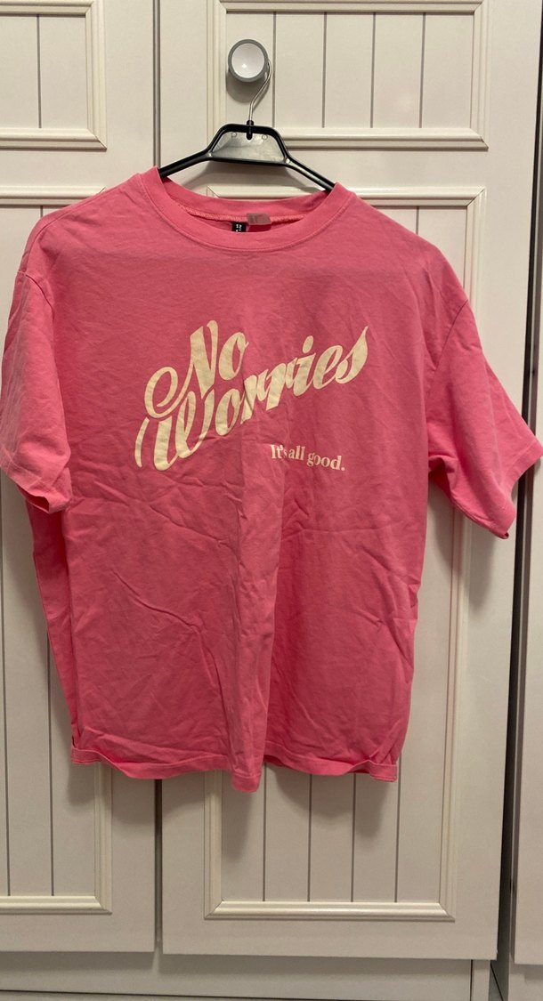 Pembe kısa kollu, rahat kesim ve bisiklet yaka tişört. 'No Worries' baskılı, yumuşak keten kumaştan günlük kullanım için uygun.