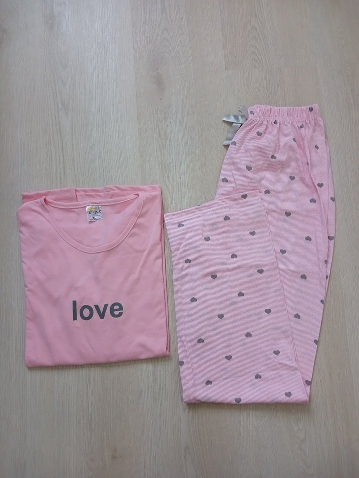 Bu bol kesim pijama takımı, kısa kollu ve pastel pembe renktedir. Üstte 'love' yazısı, alt ise küçük kalp desenleriyle rahat ve sokak stilini yansıtır. Alt pijamada kucuk deformasyon mevcuttur