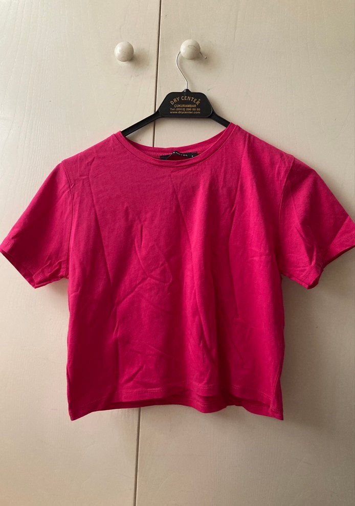Yumuşak kumaştan yapılmış pembe kısa kollu yuvarlak yaka tişört. Salaş kesim ve normal boyda, günlük kullanıma uygun minimalist sokak stiliyle.