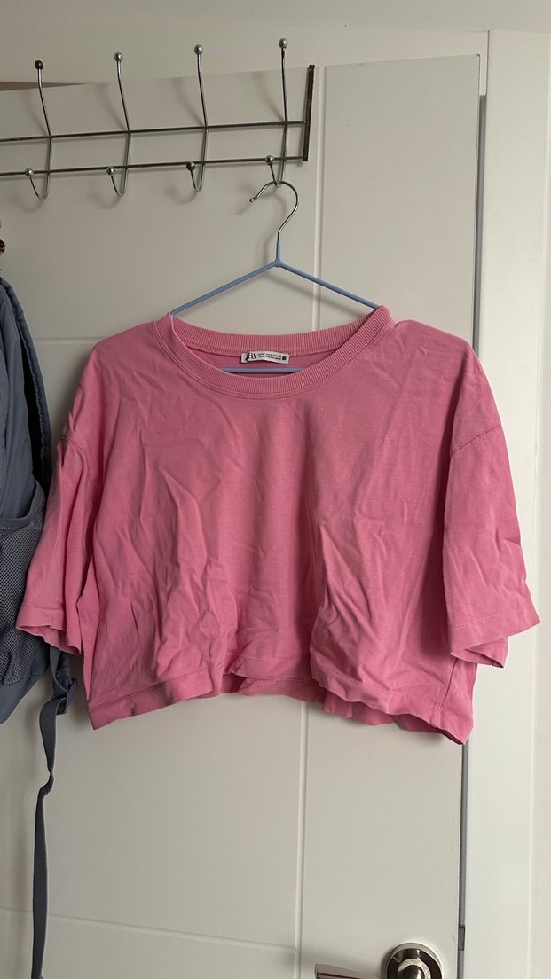 Pembe renkte, kısa kollu ve salaş kesim kadın tişörtü. günlük kullanım için rahat ve şık bir tasarım önünde birkaç damla beyaz boya lekesi var fotoğrafta görülüyor