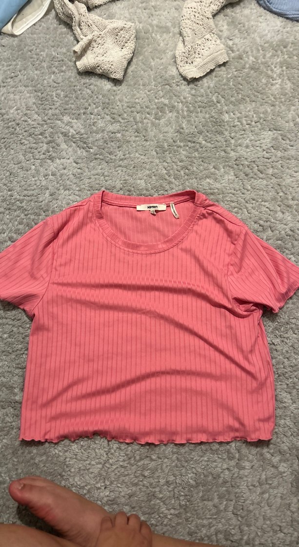 Pembe kısa kollu tişört, yuvarlak yaka ve salaş kesime sahiptir. Yumuşak sentetik kumaştan yapılmış, ince çizgili dokusu ve rahat boyu vardır. Günlük rahat kullanım için uygundur.