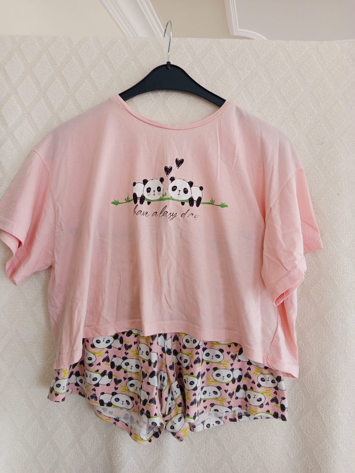 Bol kesim, kısa kollu, yuvarlak yakalı pijama takımı. Pastel pembe üstü sevimli panda baskılı, şortları desenli.