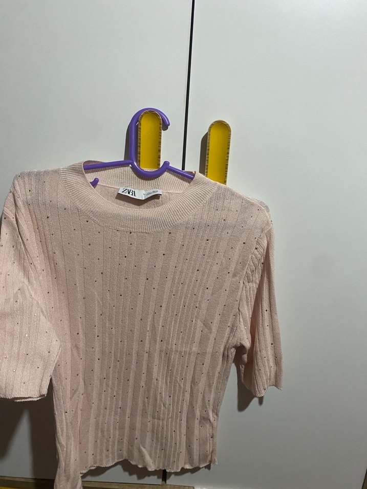 Pembe pastel renkte, kısa kollu ve yuvarlak yaka triko kazak. Salaş kesimi ve kısa boyu ile günlük rahat sokak stiline uygundur.