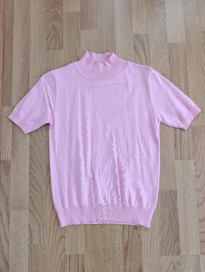 Pembe pastel tonlarında, kısa kollu ve bisiklet yaka, ince ve yumuşak triko kumaştan üretilmiş, sade ve vücuda oturan kadın kazak. Günlük kullanıma uygundur.
