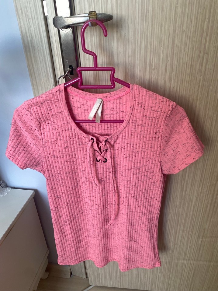 Kız çocukları için pastel pembe tonlarında, kısa kollu, triko kumaştan yapılmış, bağcıklı yaka detaylı, fitted kesim tişört.
