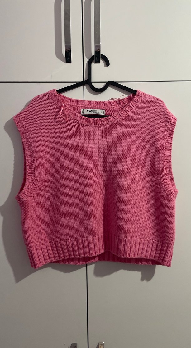 Pembe renkte, kısa ve örgü dokulu, kolsuz kadın süveter. Yuvarlak yaka ve bol kesimle rahat bir görünüm sunar.