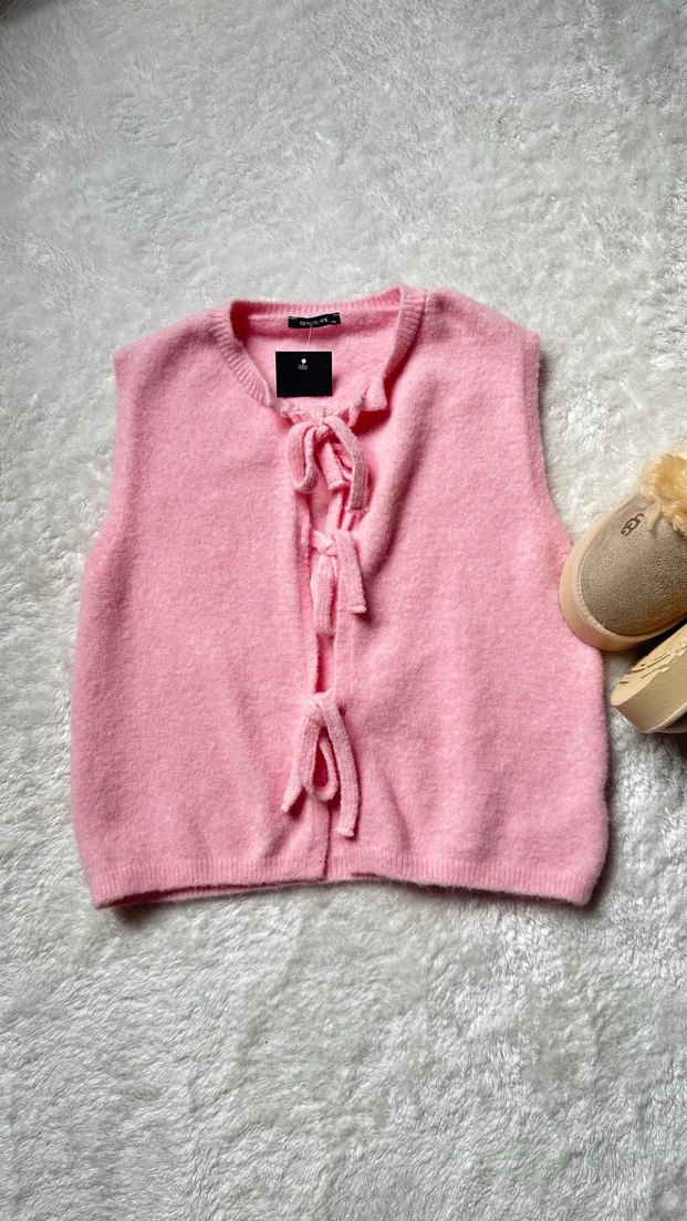 Pastel pembe renkli, kolsuz, örgü kumaştan yapılmış gevşek kesim ve yuvarlak yakalı kısa süveter. Önde bağlama detayları bulunur, rahat sokak stili için uygundur. Standart beden