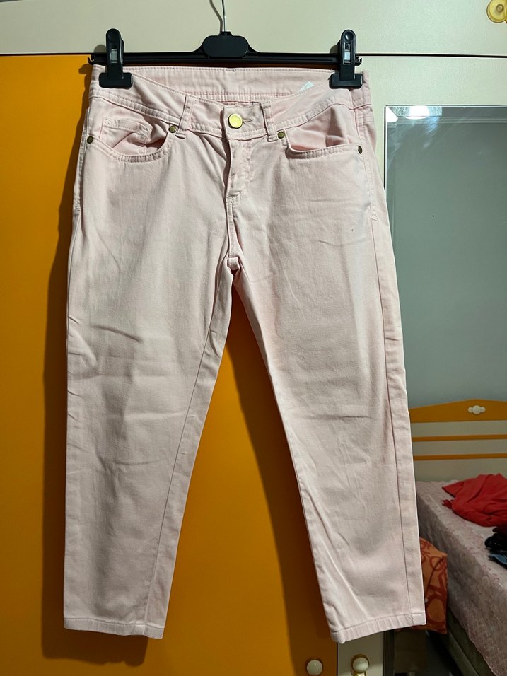 Pembe renkte kısa paça pantolondur. Düşük beldir. Herhangi bir hasar ya da lekesi bulunmamakta.