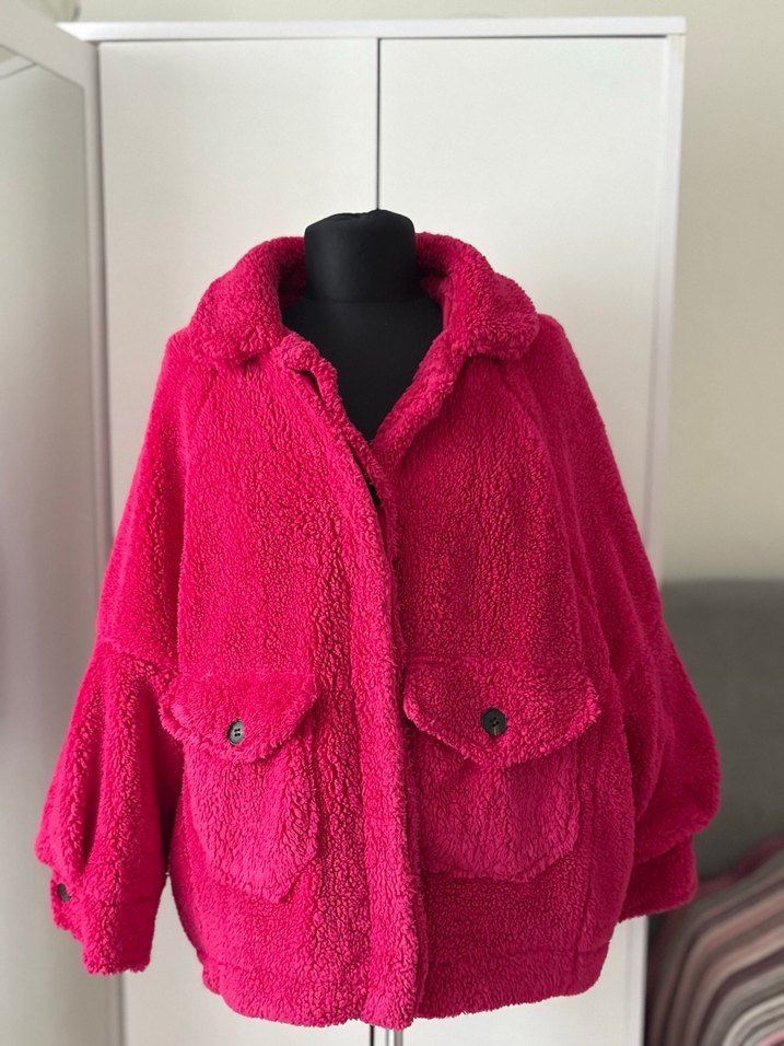 Pembe kısa boy kadın ceketi, yumuşak ve sıcak peluş kumaş, kürk detaylı, kesik yaka, bol kesim ve uzun kolludur. Cep detaylarıyla renkli bohem tarzına uygundur.