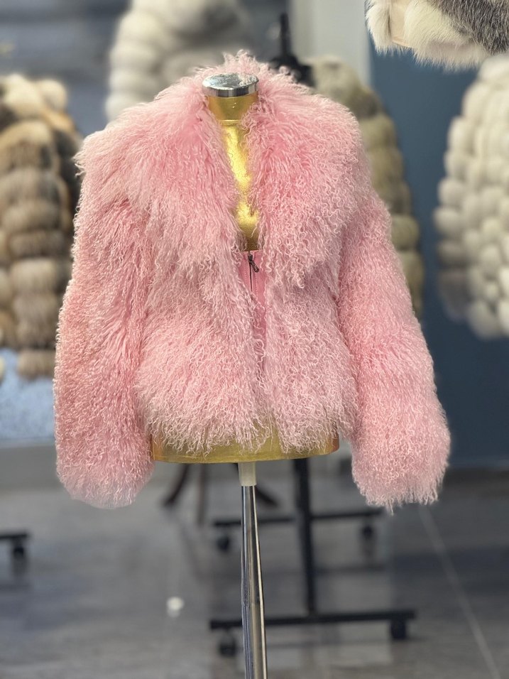 Pembe kısa suni kürk ceket, uzun kollu ve yaka detaylı, rahat kesimiyle şık ve rahat bir sokak modası parçası.