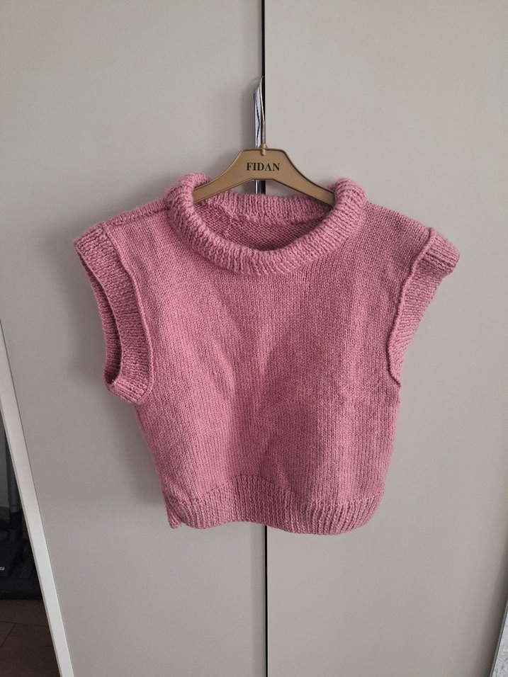 Gevşek kesim, kolsuz pembe triko süveter. Bisiklet yaka ve kısa boyda, düz ve rahat dokuda. Günlük kullanıma uygun, pastel tonlarda, sade normcore tarzda. Askıda FIDAN markası yer alıyor.