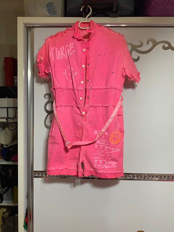 Pembe kısa tulum, yakalı ve kısa kollu olup, bol kesimdir. Düğmeli ve renkli batik desenlidir, sokak modasına uygundur. Az kullanılmıştır hiçbir sorunu yoktur S-M uyumludur