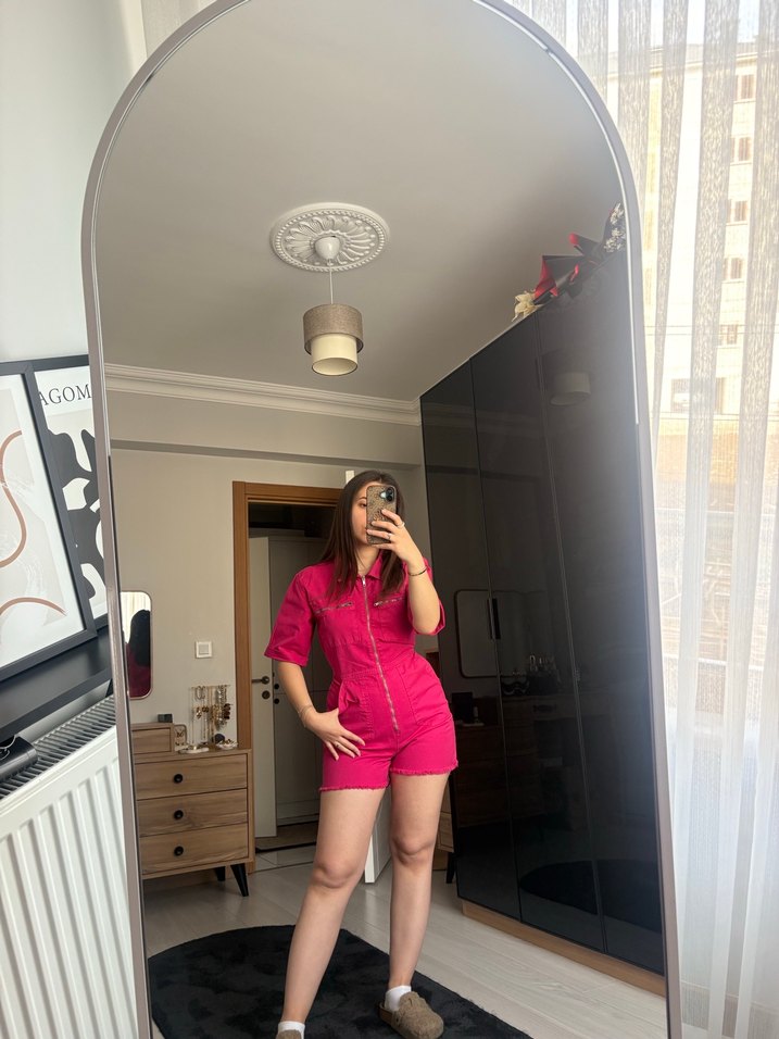 Oturmuş kesime sahip kısa tulum. Fuşya rengi. Boy 1.57 kilo 55 ürün S beden