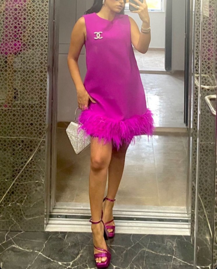 Kolsuz, askısız pembe mini elbise, etek ucu tüy detaylı. Rahat kesim, parlak sentetik kumaş, parti için uygun.