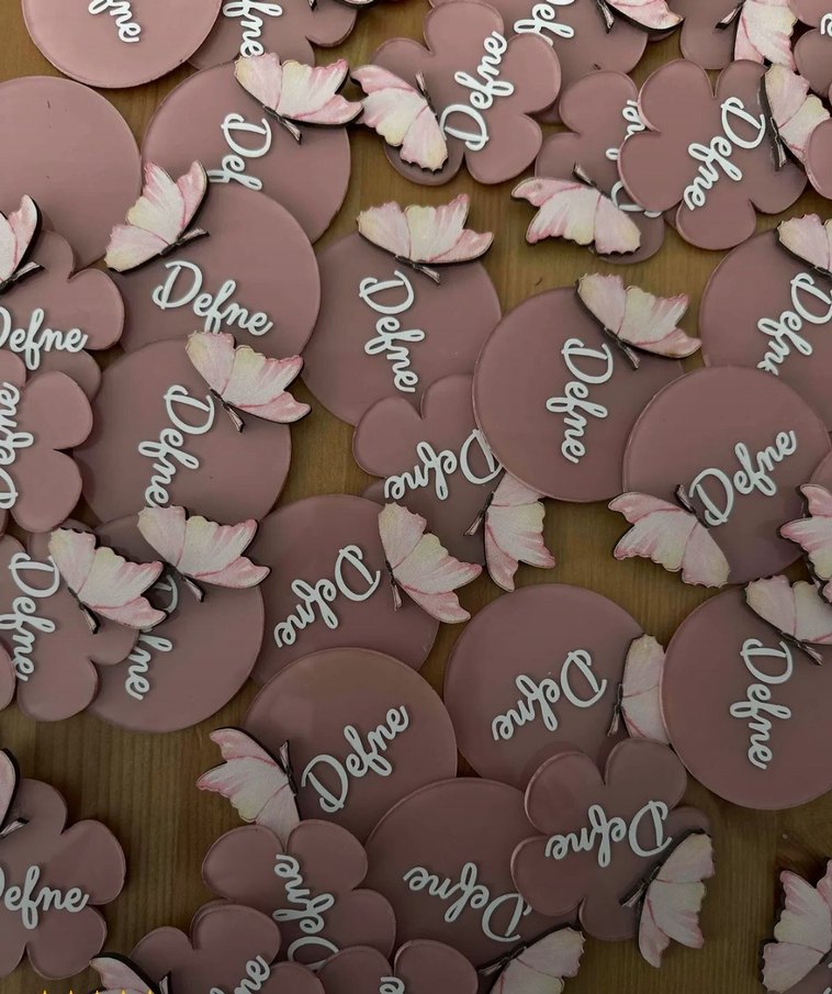 Pastel pembe renkli, üzerinde 'Defne' yazısı ve kelebek figürü bulunan kişiye özel hediyelikler.