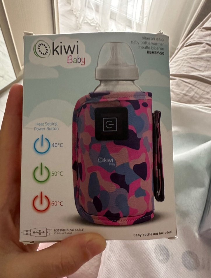 Pembe Kiwi Baby biberon ısıtıcı, 40°C, 50°C ve 60°C ısı ayarları ve USB kablo kullanımı ile birlikte gelir.