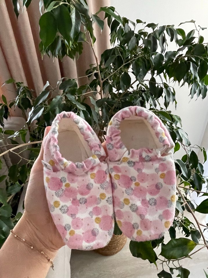 Pembe, pastel tonlarda desenli, ve kumaştan yapılmış kız bebek ev patiği az kullanıldı 21 ile 24 arası ayak için rahat olur