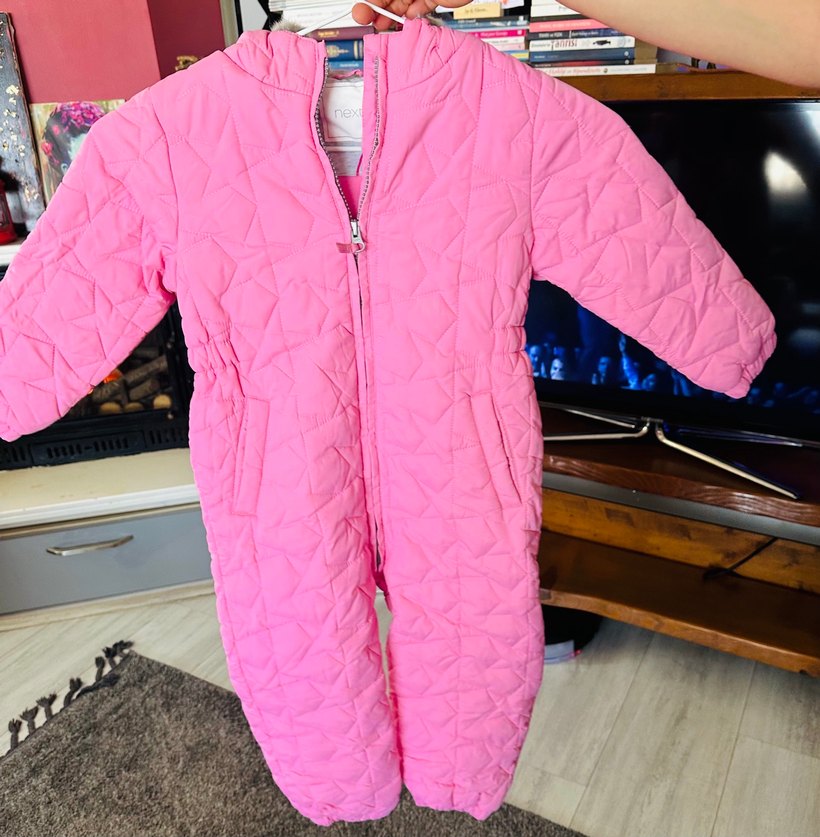 Pastel pembe renkli kız bebek kar tulumu, fermuarlı ve yakalıdır. Yumuşak kapitone dokusu soğuk havalar için uygundur. ❄️