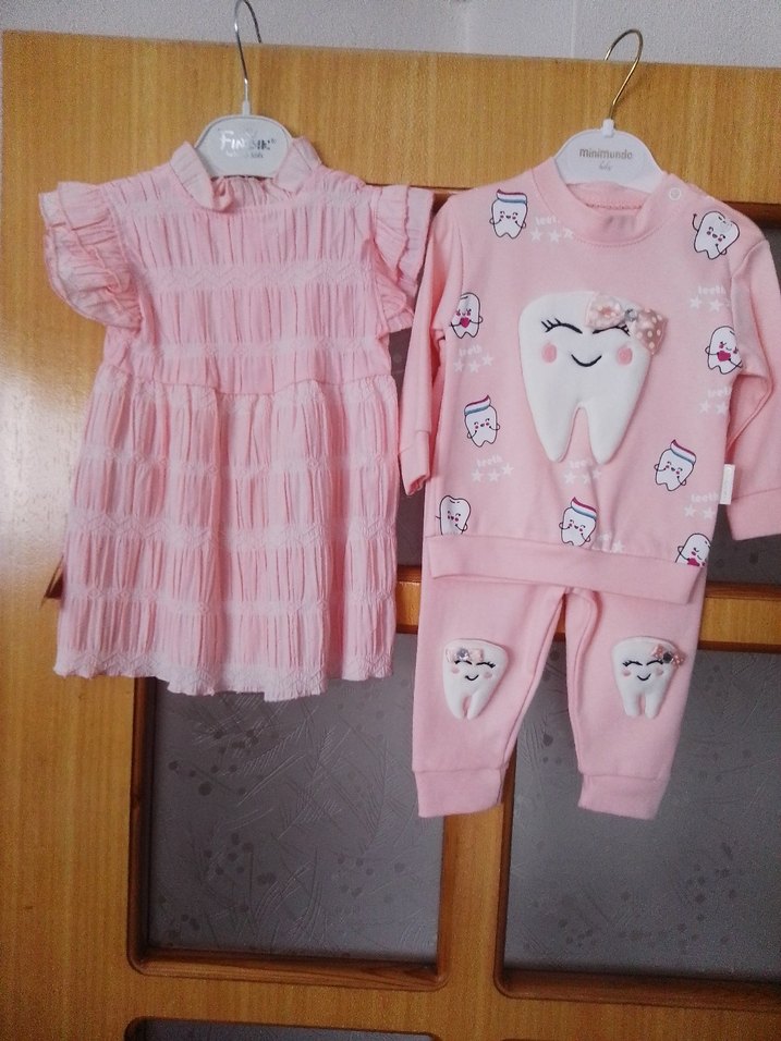 Pembe pastel tonlarda, fırfırlı elbise ve nakışlı kısa kollu üst ile diş desenli pantolon takımı.