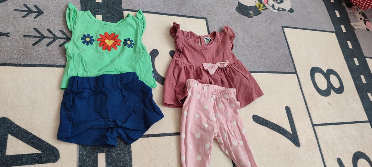 Pembe tonlarında kısa kollu, fırfırlı üst ve beyaz puantiyeli açık pembe tayt içeren bebek kız kıyafet takımı. Rahat ve yumuşak kumaş.