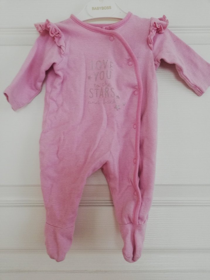 Pastel pembe renkte, omuzlarında fırfır detaylı, önünde hafif kabartmalı yazı bulunan, uzun kollu bebek tulumu.