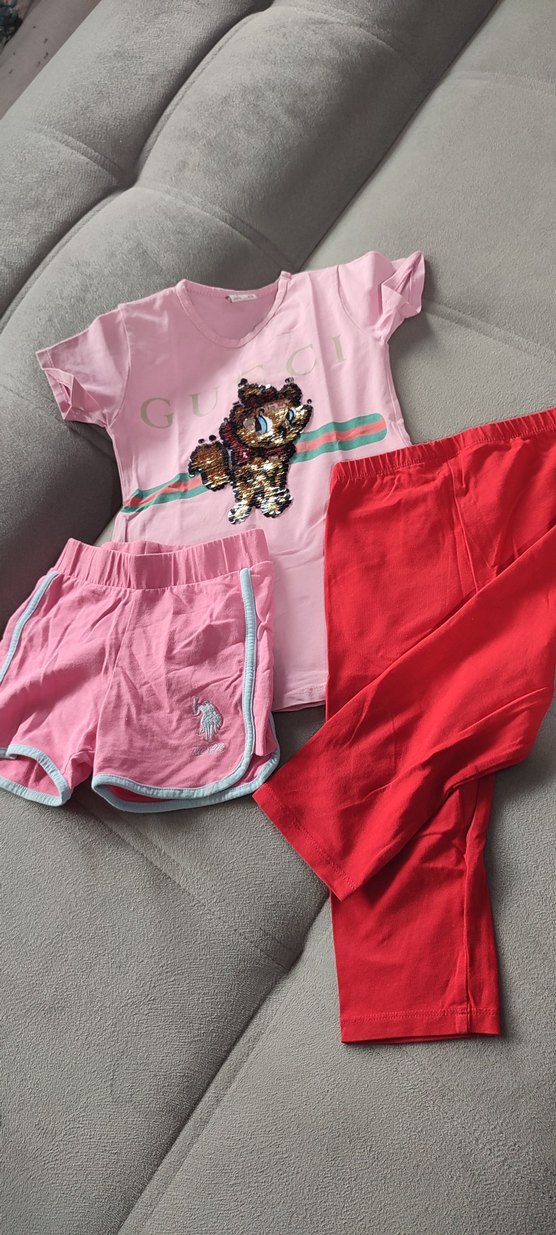 Pembe kısa kollu baskılı üst, şerit detaylı pembe şort ve kırmızı tayt içeren kız bebek takımı, zahmetsiz şıklık sunar. Hiçbir kusuru yoktur, şort uspa markadir