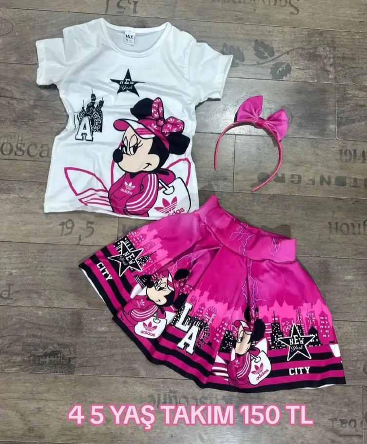 Renkli, baskılı kısa kollu üst, şehir temalı desenli etek ve pembe fiyonklu saç bandından oluşan kız bebek kıyafet seti.
