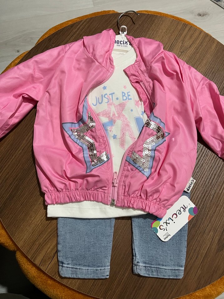 Pembe uzun kollu ceket, yıldız payet detayları ve 'JUST-BE' baskılı iç tişört ile birlikte. Cırt cırt kapanma ve açık mavi pantolon içerir. 3lü takım