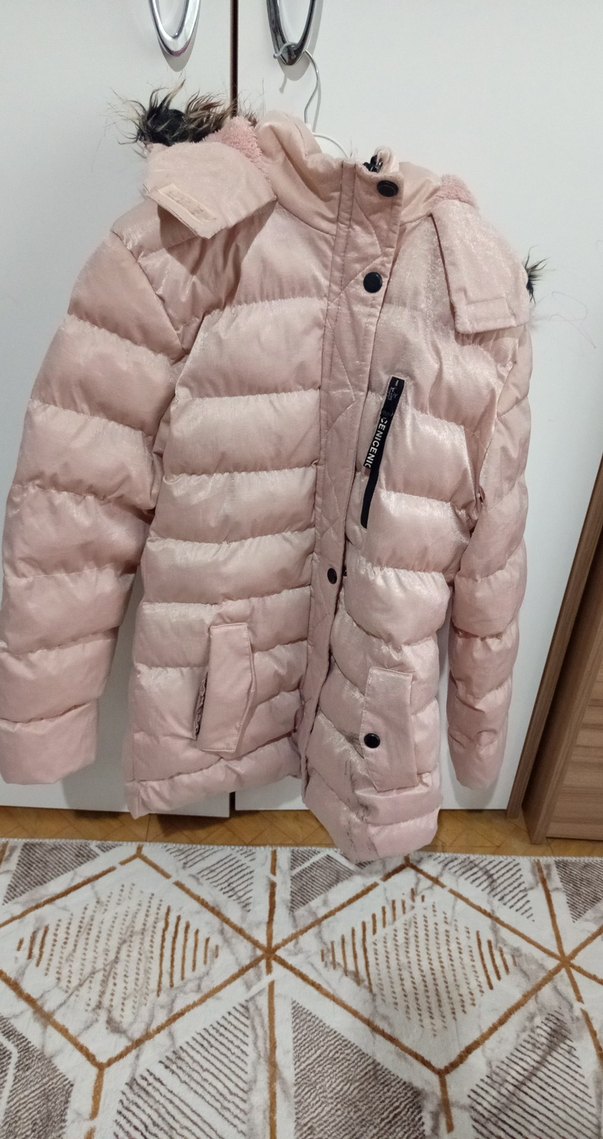 Pembe renkte, kürklü detaylı, normal uzunlukta ve kesik yakalı kadın kışlık mont. Yumuşak sentetik kumaştan, uzun kollu ve rahat kesimdir. ❄️