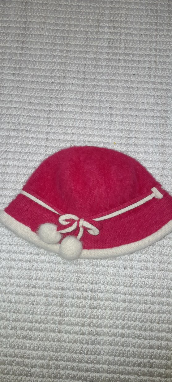Pembe örgü çocuk şapka, beyaz şerit ve ponpon detaylarıyla renkli ve sıcak bir aksesuar sunar.