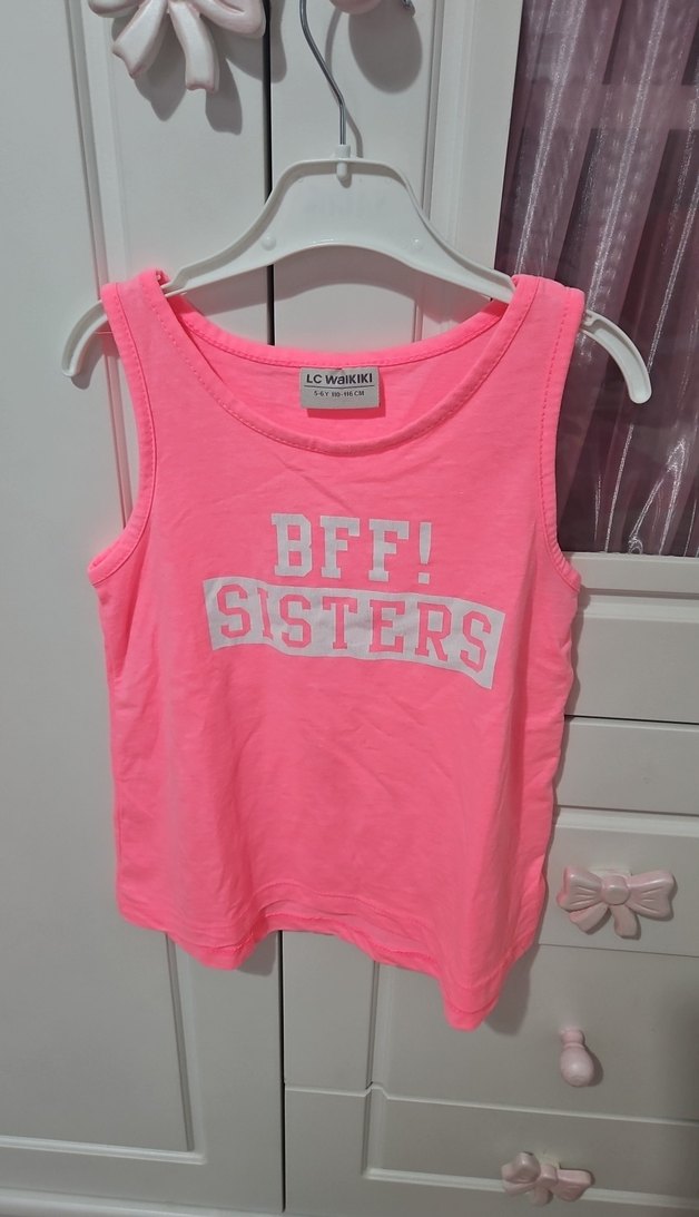 Pembe tonlarında, baskılı "BFF! SISTERS" yazılı, kolsuz ve dar kesim kız çocuk tişörtü. Rahat ve şık günlük stil için uygun.