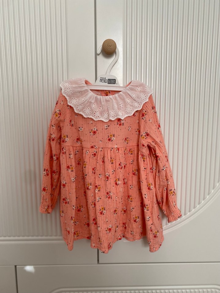 Pamuklu, uzun kollu, yakalı ve fırfırlı detaylı, bol kesim pembe kız çocuk elbisesi. Çiçekli baskı ve bohem tarzı öne çıkar.