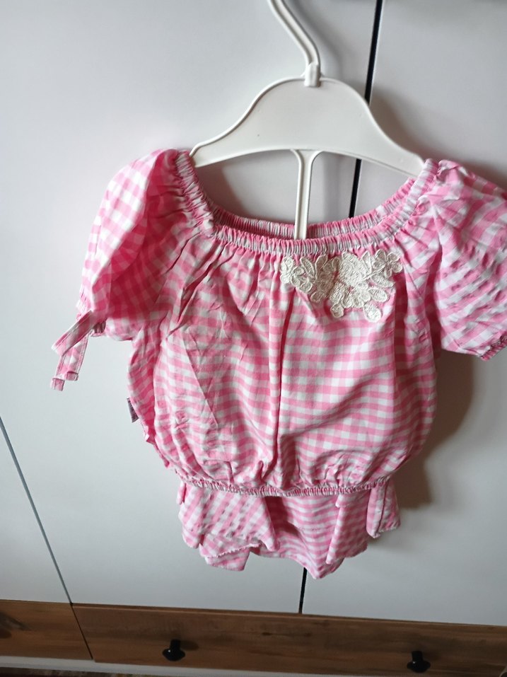 Pembe, straplez, kısa kollu ve bol kesim kız çocuk bluzu. Pamuklu kumaş, nakışlı dantel detayları ve pastel kareli deseniyle dikkat çeker.
