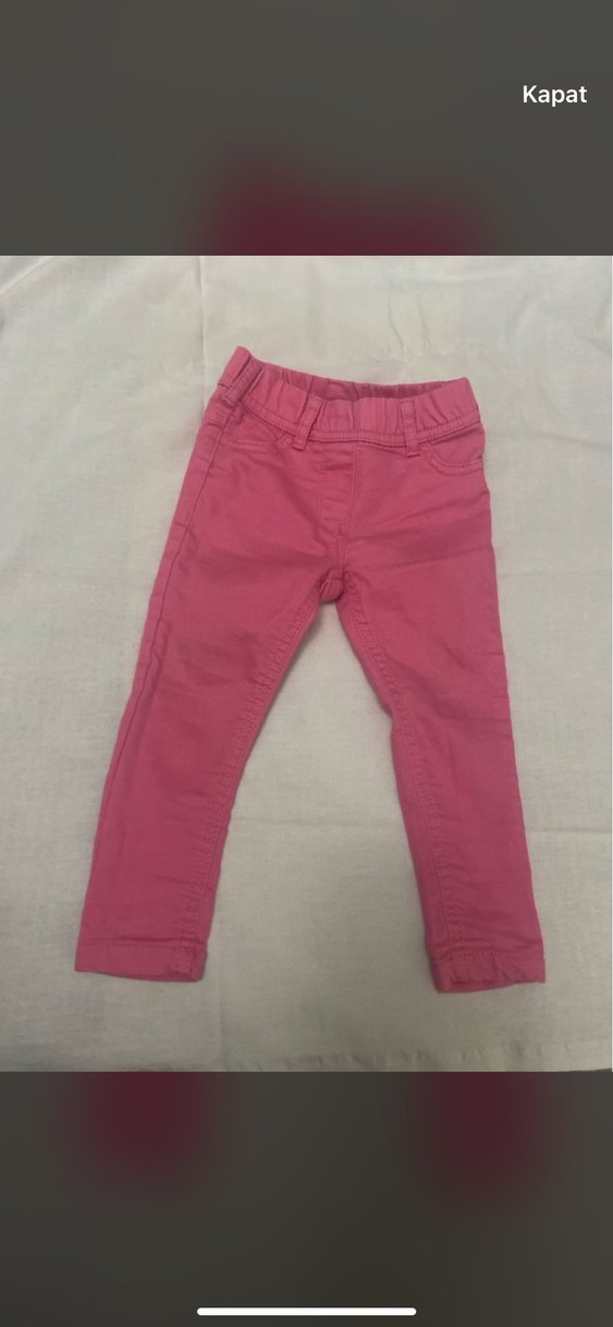Pembe, dar kesim kız çocuk pantolonu, elastik bel bandına sahip. Yumuşak sentetik kumaştan, sade ve renkli normcore tarzda.