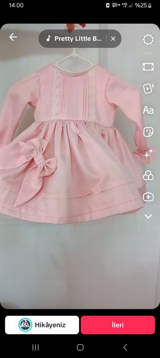 Pembe kız çocuk elbisesi, uzun kollu ve bol kesimdir. Pamuk saten kumaştan modern klasik bir modeldir. Eteğinde tokası mevcuttur.Arka fiyonk demontedir.