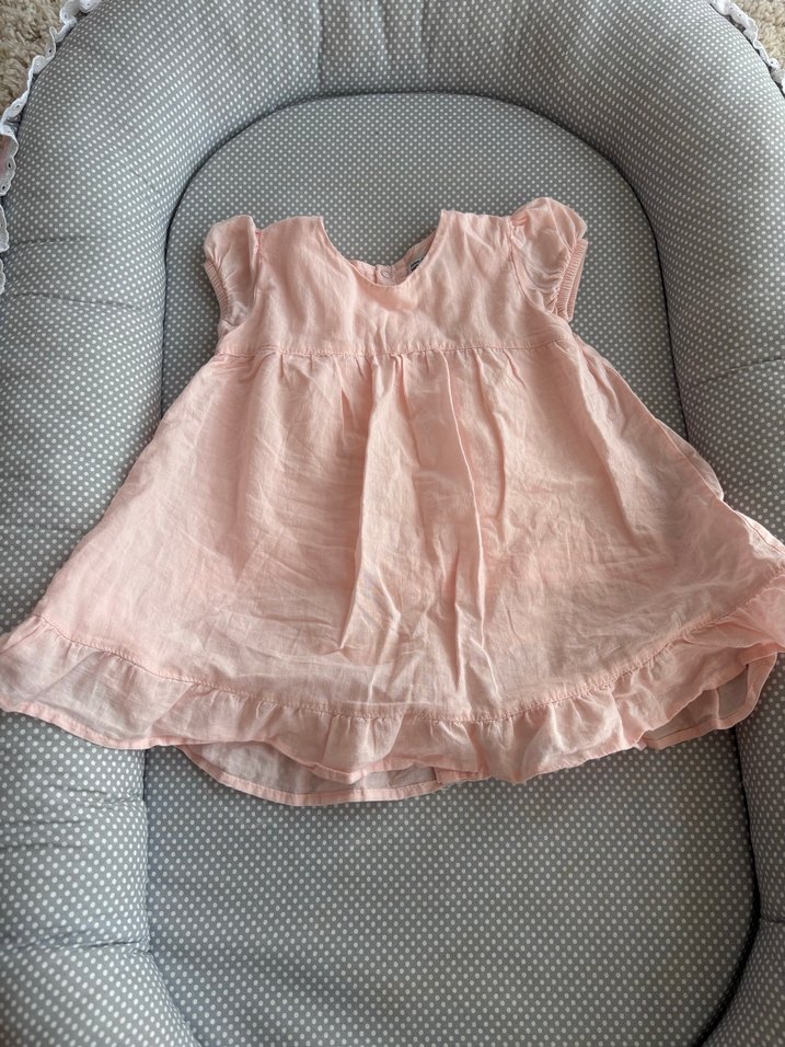Pembe kolsuz, bol kesim kız çocuk elbisesi. Etek ve kollarda fırfır detayları vardır. Pastel tonlarda, V yaka ve sade bir tasarıma sahiptir.
