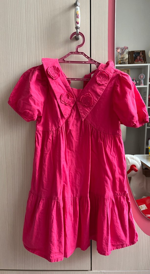 Pembe, bol kesim kız çocuk elbisesi. Volan detaylı, V yakalı, askılı kollu ve desensiz renkli tasarım.