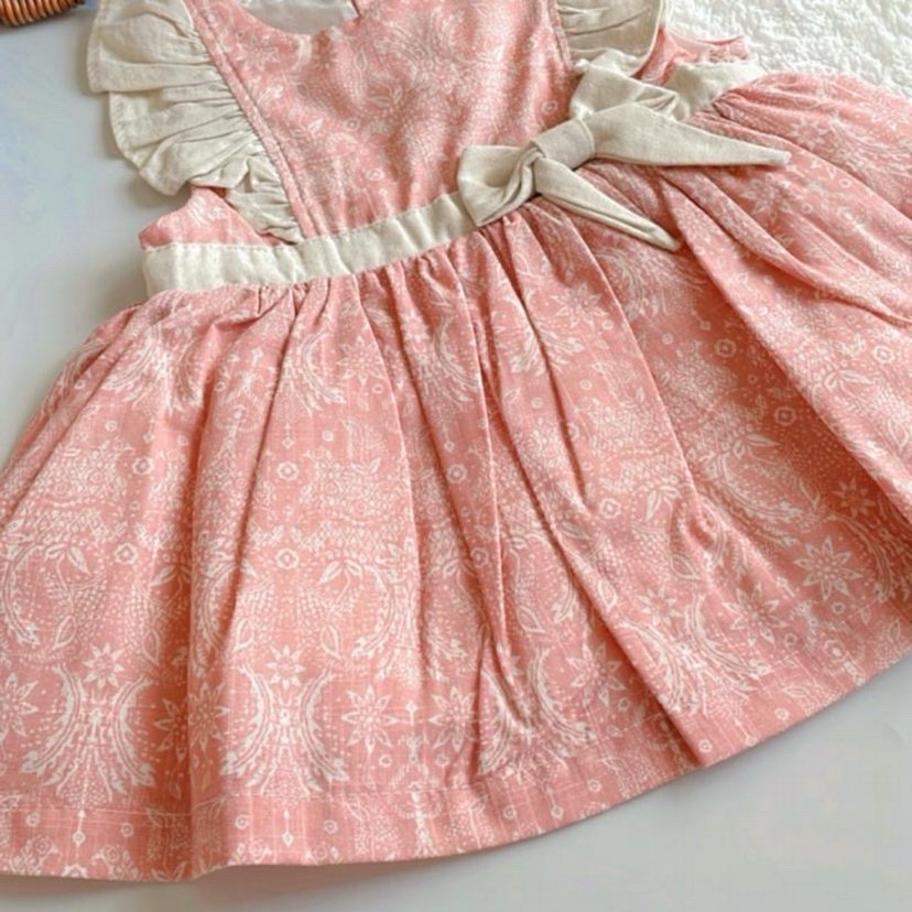 Pembe kız çocuk elbisesi, tekne yakalı, kolsuz ve bol kesimdir. Yumuşak kumaştan, bohem tarzda ve fırfır detaylıdır. Belde dekoratif fiyonk bulunur.