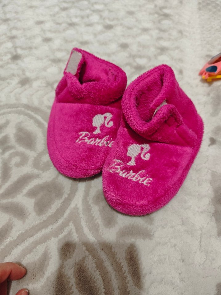 Pembe, yumuşak ve sıcak dokulu örme kız çocuk ev terliği, üzerinde Barbie nakışı bulunur.