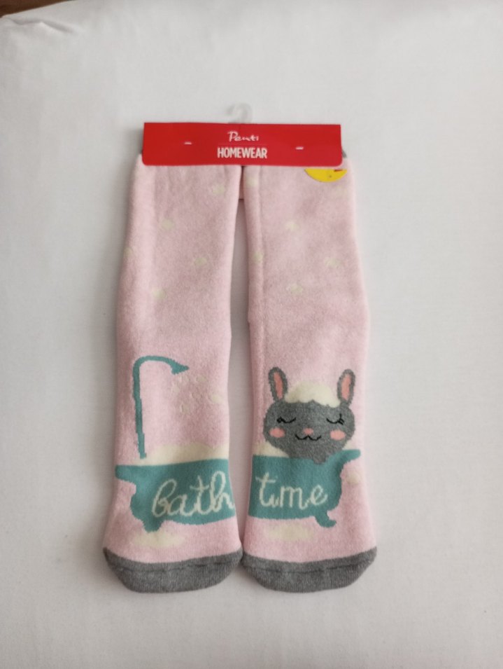Yumuşak ve sıcak kumaştan, pastel pembe renkte kız çocuk ev terliği çorapları. Baskılı banyo zamanı deseni ve gri burun detayları bulunur.