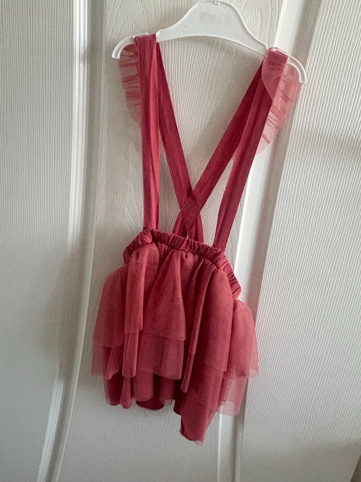 Pembe, askılı ve fırfırlı detaylara sahip, straplez yakalı kız çocuk elbisesi. Bohem tarzda, yumuşak sentetik kumaştan üretilmiştir.