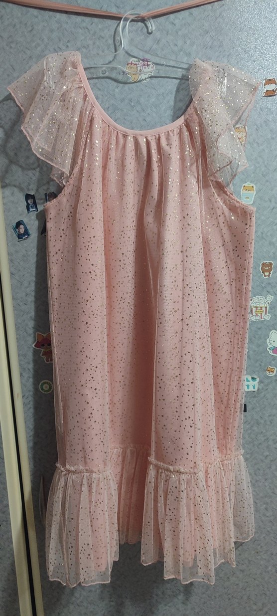 Pembe pastel renkli, fırfırlı detaylı ve nakışlı desenli kız çocuk askısız elbise. Yumuşak sentetik kumaştan, bol kesimli ve bohem-retro tarzında.Sadece bir kez giyildi çok iyi durumdadır.