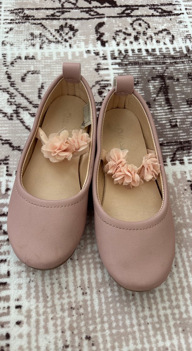 Pastel pembe renkli, fırfırlı detaylara sahip kız çocuk babet ayakkabılar, klasik zarafet ve sade tarz sunar.
