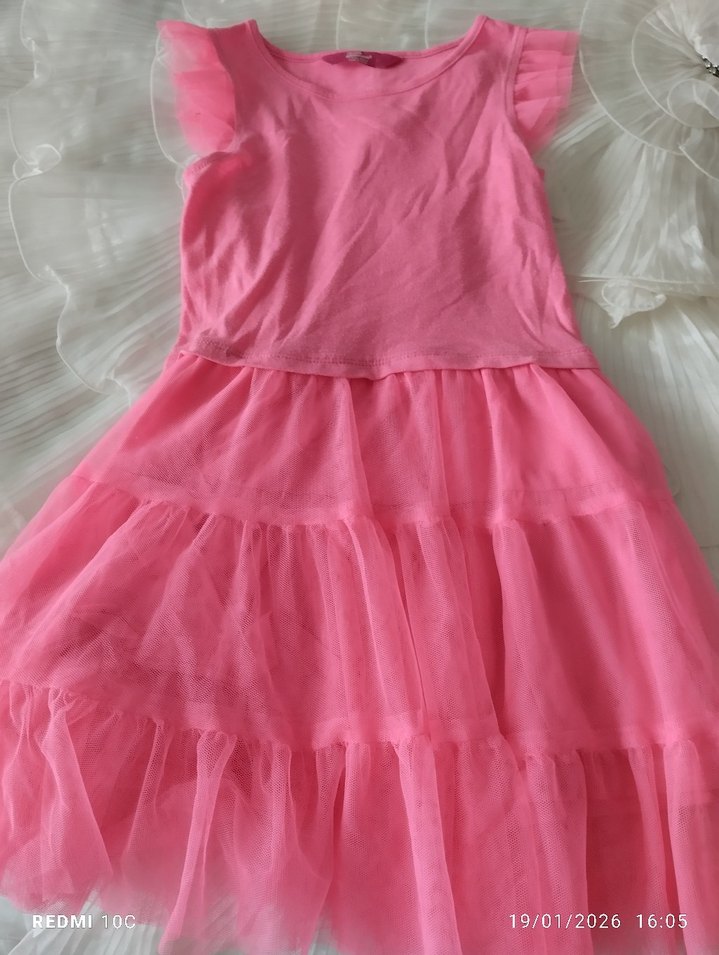 Pembe renkli, fırfırlı detaylı, kolsuz ve bol kesimli bohem tarzda kız çocuk elbisesi. Pastel tonlarda, yuvarlak yakalı ve hafif dokuda.