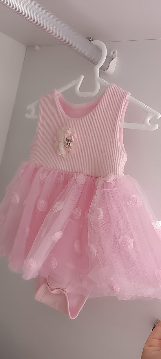 Pembe, kolsuz, fit kesim triko elbise. Nakışlı tül etek ve çiçek aplikeli detay içerir.