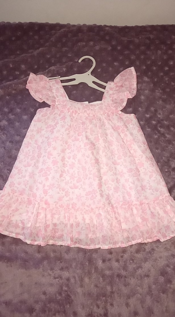 Pembe pastel renkli, fırfırlı ve salaş kesimli kız çocuk elbisesi. Kolsuz ve bohem tarzda, sentetik kumaştan yapılmıştır.hiçbir kusuru yoktur sayılı giydirilmiştir.bir buçuk yaşına kadar olur
