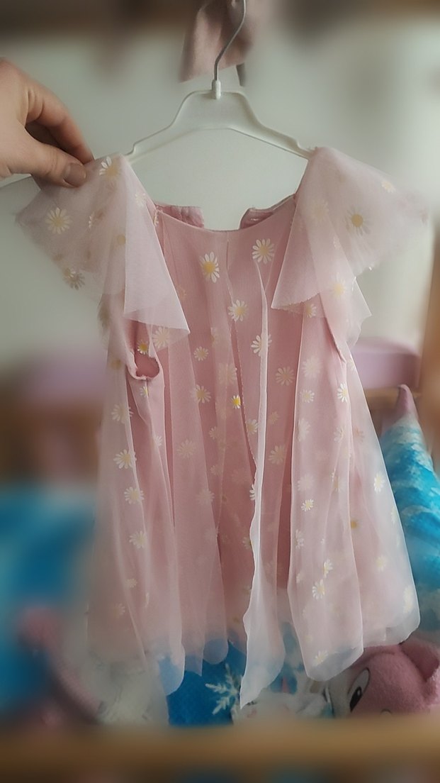 Pembe, kolsuz, fırfırlı detaylı, askısız yaka ve bol kesim kız çocuk elbisesi. Yumuşak sentetik kumaştan, pastel tonlarda batik desenli, bohem tarzda.